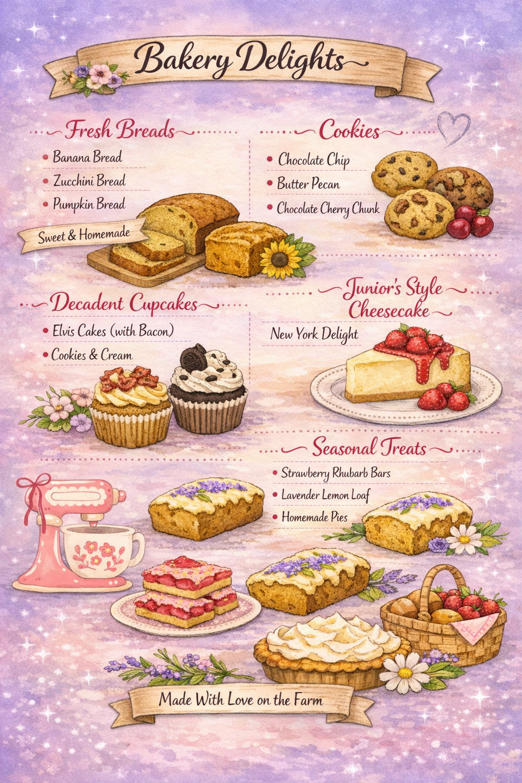 We’re still putting the finishing touches on our full bakery menu — but here’s a sweet little sneak peek of what’s coming soon. From cozy classics to creative indulgences (Banana Bread Brownies, anyone?), everything is handmade with love, faith, and a dusting of flour from our humble farm kitchen.